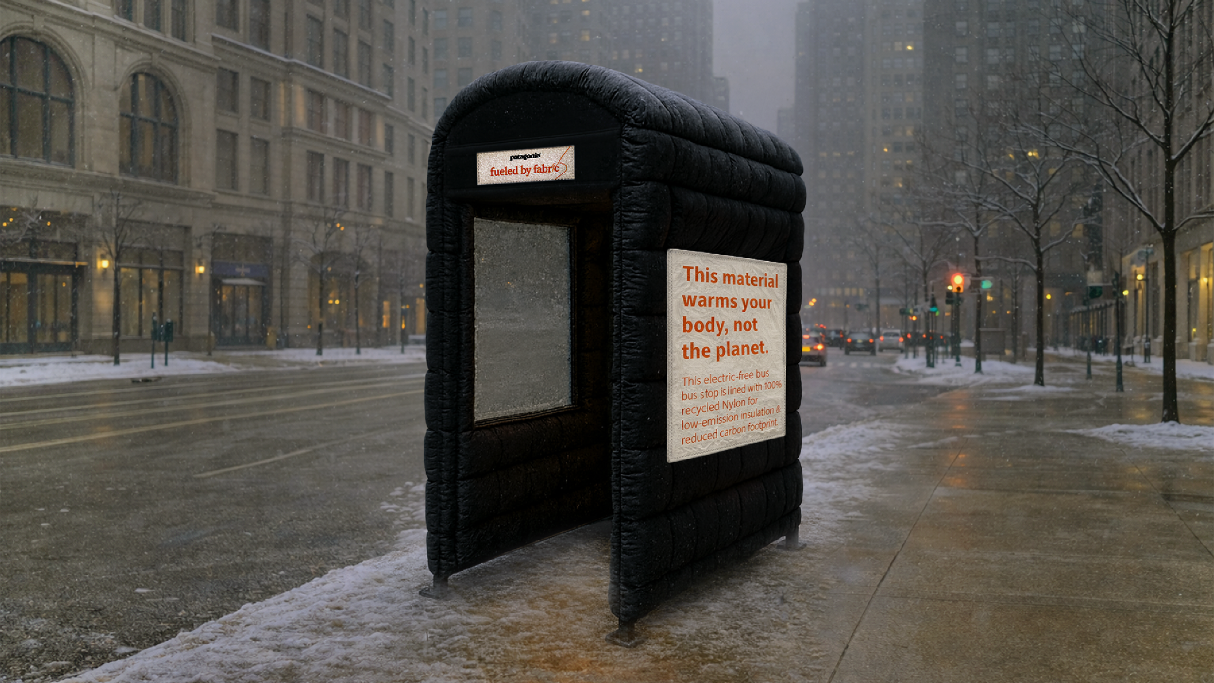Heated bus stops are a necessary refuge in harsh winter climates. This one in particular only uses the insulating power of 100% recycled puffer.